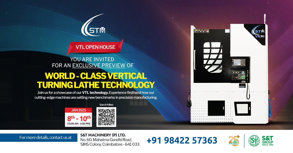 S&T Machinery invites all to STM Open House 2025 event in Coimbatore on January 8th, 9th ,10th 2025. STM CNCs STM open house 2025 is taking place at STM Factory, SIHS Colony, showcasing its wide range of top quality CNC Vertical Turning Lathe Machines